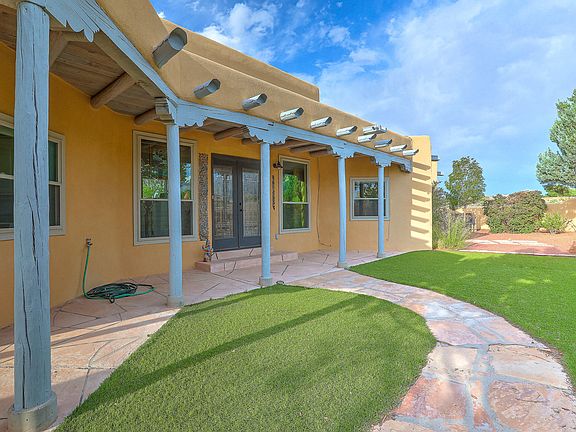 Melt into the serenity of Placitas living in your adobe-style home with soaring eastern views of the Sandia Mountains & western views of the Jemez range. A peak indoor-outdoor living home with a covered front patio, enclosed front courtyard, & enclosed back yard with an incredible sun deck. The entire home is electric, and with owned solar panels, utility bills run incredibly low year-round. Enjoy refrigerated air conditioning and heating that is climate controlled in each room through the mini split system. The living room has wooden beam-adorned high ceilings, saltillo tile flooring, & warm adobe walls centering around a wood burning fireplace. Cook in style in your functional kitchen with talavera tile countertops & abundant cabinetry & storage.