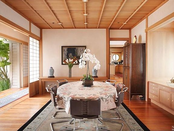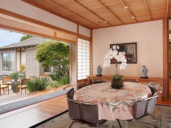An exquisite blend of western and Japanese aesthetics with visual appeal around every corner.Sweeping views from Bay Bridge to SF to Mt.Tam & adj.open space.Precision craftmanship,fully retractable walls of glass & shoji screens for seamless indoor/outdoor flow.Shoji panels function to create a unified space or intimate salons.4 bdrm suites plus powder room,pool with cascading waterfall, deck and gardens. Utmost privacy and easy access to 101. Current as of 2012-06-25.
