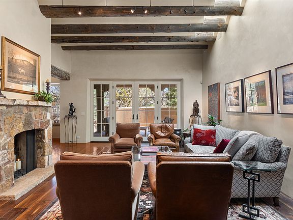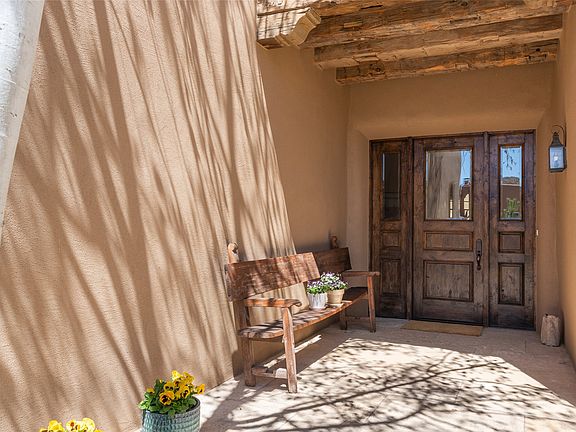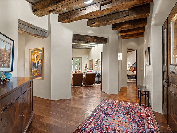 Nestled in Santa Fe’s Historic Eastside and within walking distance to Canyon Road, this exquisite, single level 3250 sq. ft. adobe home was designed by Robert Frank and built in 2009. It is subtle in elegance and sophistication. The property is situated on a .77 acre private, parklike lot graced with mature pines. The finishes are of superior and artistic quality to include: arched thresholds, beautiful interior stone walls, distressed wide-plank walnut flooring, antique barn beams and skylights that illuminate the hand-troweled diamond plaster walls creating a timeless ambiance iconic to Santa Fe. The living area is centered around a large stone fireplace with stone mantel and gives way to a generous dining area. A large chef’s kitchen is equipped with top of the line appliances and is central to the dining area and office. Each of the 3 bedrooms is en-suite, with 4 bathrooms in total. Ideal for entertaining or simply enjoying the quiet of the outdoors, a deep portal wraps around the living spaces and primary bedroom and is surrounded with professional landscaping. With a 2-car garage, additional parking spaces, a new roof and exterior stucco, this residence offers modern comfort and classic design