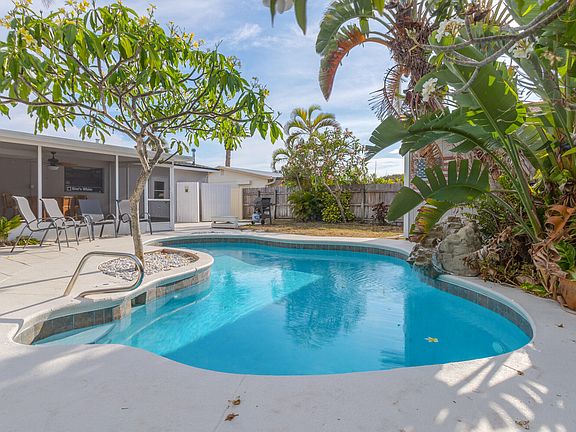 Charming mid century modern beachside 3/2 pool home just blocks to the beach. Fully furnished $3500 per month minimum rental 3 months includes utilities now until December 31st. $5000 for January 1, 2026-May 1, 2026. 12 month lease furnished/unfurnished $3250 per month not including utilities. This home is well cared for! Private tropical fenced in backyard oasis with in-ground heated pool. Extra large screened in porch. Lawn and pool care included. Located close to Pineda Causeway, Patrick Air Force and a short drive to Viera.