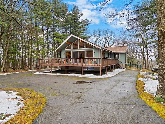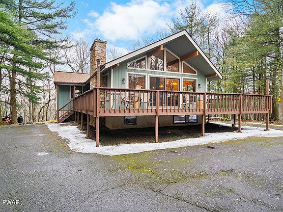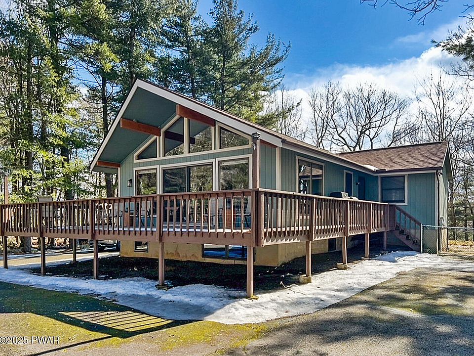 Move in ready! Mint condition ranch with vaulted ceilings and open concept design. Private setting includes adjacent lot. Lake rights to motor boating Lake Wallenpaupack. Primary suite. Three bedrooms with new carpeting, and two full baths on main floor. Additional bunk room on lower level. . Fireplace with wood burning stove. Lots of windows and light. Wrap around decking that is dog and child safe with attached fenced yard. Perfect for children and pets. New roof. New furnace. Outside of house has been freshly painted, along with inside great room. Partially finished lower level with windows, walk out door, laundry area, bunk room, office/recreation room, workshop and storage area. Large fire ring set up on adjacent additional lot. Circular paved driveway. Meticulously maintained. Full time or vacation home. Private yet so close to town, restaurants, shopping, lakes, state game lands, parks, and so much more. Hike, kayak, motor boat, swim, ski, nature watch, or just relax! Commutable distance from NYC and other major metro areas. Low taxes. Turnkey...just pack a bag and start enjoying! Don't wait, this one won't last!