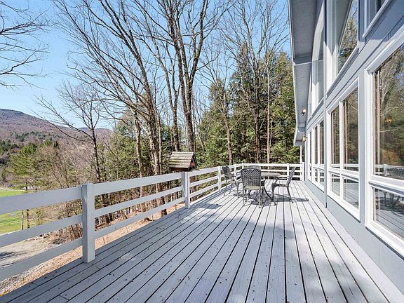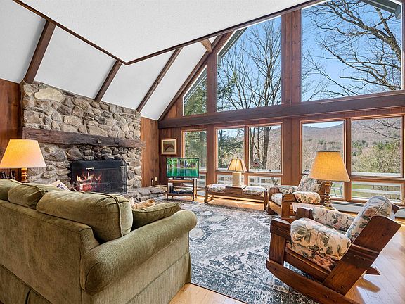 Perched on 2.8 acres, this well-maintained vintage chalet features a spacious deck and an inviting open floor plan, ideally oriented to the south. A dramatic wall of windows frames sweeping, bucolic mountain views, filling the interior with natural light and seamlessly blending indoor comfort with the surrounding landscape. Located just across the street from Stowe’s scenic recreation path and only five minutes from world-class skiing at Stowe Mountain Resort, this home is a perfect base for outdoor adventures or enjoying all that the Stowe community has to offer. At the heart of the home is a welcoming living room anchored by a striking field stone fireplace and warm hardwood floors. The open-concept living area flows seamlessly into the dining space and large kitchen, creating an open, airy feel that’s perfect for gathering and entertaining The main level includes a comfortable primary bedroom with a full bath, while the second floor offers two generously sized bedrooms and an additional full bath. The finished lower level is designed for fun and relaxation, complete with a cozy lounge area and a beautifully crafted wooden bar—perfect for après-ski evenings or casual gatherings.