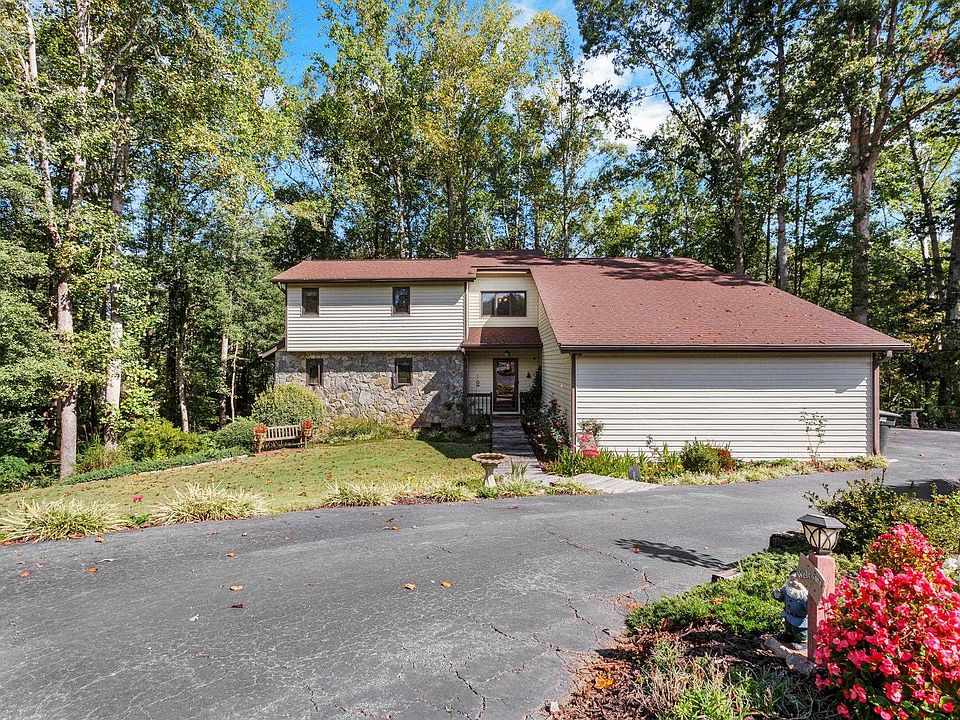 This is not a cookie cutter home! Located at the end of a cul-de-sac on 1.18 acres this contemporary home is a jewel. Once you enter the frontdoor the VAULTED CEILING living room with STONE FACED WOOD BURNING FIREPLACE and WET BAR is straight ahead. The SUNROOMoverlooked the wooded back yard and leads you onto the brand NEW DECK. The kitchen offers GRANITE COUNTERS, STAINLESS STEELAPPLIANCES, a BREAKFAST AREA and doors to a SCREENED PORCH that overlooks the small KOI POND. Formal dining room forentertaining/hobbies/office. Main floor primary suite with DOORS TO THE SUNROOM, DUAL VANITIES, WALK-IN CLOSET and SHOWER.There is a 2nd bedroom on the main level. Upstairs is a SUNNY LOFT that is open to below + 2 bedrooms and a bath. Creek at back ofproperty. Easy access to everything in Spartanburg, but peaceful living in a wooded setting.