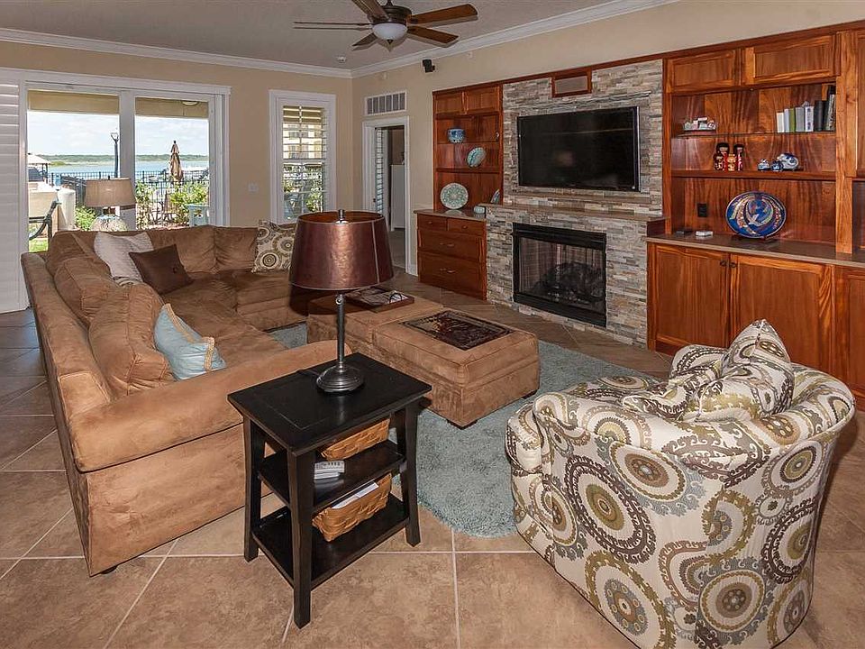 Looking for waterfront luxurious living? Sunset Harbor is a 27 unit, intracoastal front community and marina offering stunning views and spacious, elegant units that enjoy remarkable sunsets. This beautifully appointed ground floor end unit offers 3 bedrooms each with their own private bathroom and a half bath to be used when entertaining. 10' ceilings allow an abundance of natural light to flow through the richly designed open space. Ground floor offers added convenience of easy access to pool and marina and more of a resort like feel. Custom mahogany built in bookshelves and a stone accented gas burning fireplace add a touch of warm splendor. The gourmet kitchen is every chefs dream allowing you to view the boats sailing along the intracoastal waterways while you work. For the boating aficionado this home includes a 32' BOAT SLIP with power and 12000 lib lift and a harbor that is navigable at all tides. A single car GARAGE, bose surround system, security system, and under counter cooler are just a few of the extras that makes this package complete.