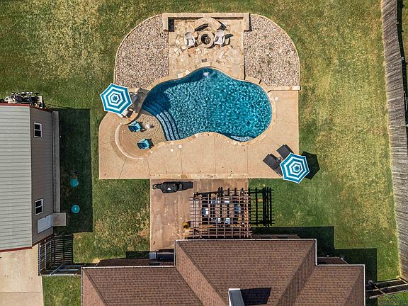 Immaculate traditional situated on half an acre in Towering Oaks, this one has it all. Fantastic plan with scraped wood floors and soaring tray ceilings with crown moulding and neutral paint. Refreshed kitchen features stainless appliances and stone counters. Primary bedroom with en-suite bath is split from the other bedrooms. Enjoy entertaining outdoors with the covered patio and pergola, gunite pool and fire pit. Work shop (26 x 30) is the perfect place for hobbies and toys. Rural feel just minutes from Loop 281 , FM 450 and I-20. Special Financing Incentives available on this property from SIRVA Mortgage.