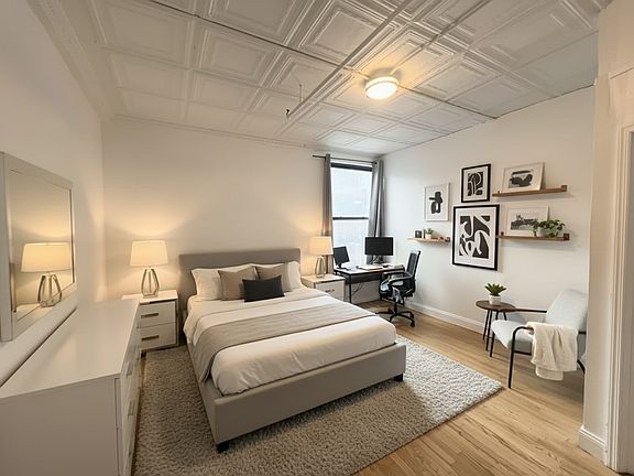 The apartment features beautiful hardwood floors, soaring high ceilings, and the convenience of an in-unit washer and dryer. The layout provides both comfort and flexibilityperfect for roommates, families, or anyone looking for a generous living space in a prime neighborhood.