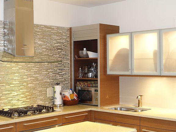 The kitchen: European "Porcelanosa" custom designed contemporary wood kitchen cabinets with top-of-the-line appliances including Miele integrated dishwasher (with custom panel), oven, range hood, gas cooktop, Subzero integrated refrigerator (with custom panel), Caesarstone quartz countertops, Extensive kitchen island with Caesar stone quartz counter tops.