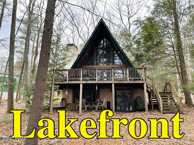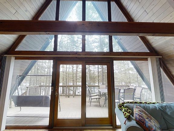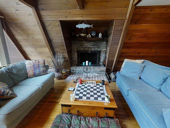 A FRAME LAKEFRONT ON WALKER LAKE Unique Peninsula offers 240 degree views of 100 acre spring fed lake with lots of prime lakefront. Post & Beam A Frame features living room with glass facade with super views, cathedral tongue n groove cedar ceilings, wood floors and stone fireplace, country kitchen with appliances and bright dining, 3 bedrooms, 2 &1/2 baths, family room with brick fireplace and views, large lakeside deck, and easy access to private dock and lake. The best spot on a beautiful lake., Beds Description: 1 BED 2nd, Beds Description: 2+BedL, Beds Description: 1 BED 2nd, Baths: 1 Bath Level 2, Baths: 1 Bath Level L, Baths: 1/2 Bath Lev 1, Eating Area: Dining Area