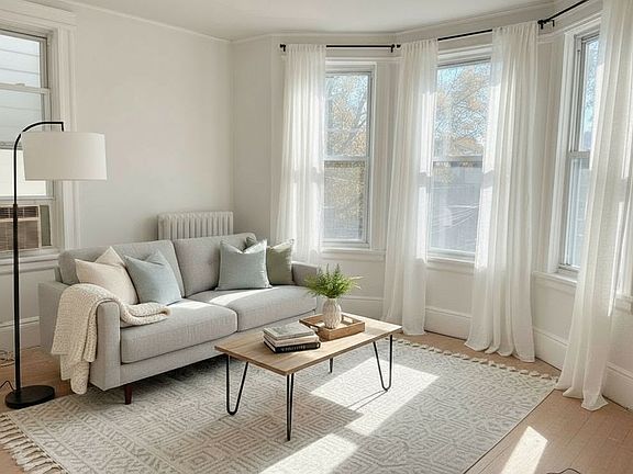 The home features a newly updated eat-in kitchen with brand-new cabinets, quartz countertop, and stainless-steel appliances including a refrigerator, new dishwasher, gas stove, and new in-unit washer/dryer. Interiors have been freshly painted, with new floors, light fixtures and spacious, light-filled rooms with two to four windows in each room.