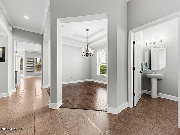 A Durbin Crossing natural and one owner beauty! Take a look at this 4-bedroom, 2.5-bathroom, pool home. With plenty of space for entertaining and family get togethers, this open floor plan will surely be a delight. Need a dedicated office or flex room? Great! It's got one of those too! The kitchen has a large island with stainless steel appliances and an updated pantry. Upstairs you will find all 4 bedrooms and an extra treat - a dry bar/coffee and tearoom! It's such a cute addition. The primary bedroom has an updated, large and classy walk-in closet. Another update upstairs is the laundry room where the washer and dryer stay with the house. How about that pool? Added in 2024, this waterfall pool will have you floating and swimming in any temperature because it has an electric chiller and heater! Relaxing in the hot tub after a long day sounds good too. You'll love the fire pit and manicured lawn along with the 3-car tandem garage that has newly epoxied flooring. It's picture perfect!