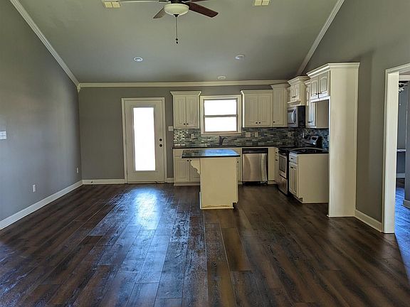 Come and see this awesome 3BR/2BA home with great open floor plan. Large living room area and fabulous island kitchen with stainless steel appliances, granite countertops, lots of cabinet space and refrigerator to convey. Primary bedroom has dual sinks on vanity and a gorgeous tile shower with rain head shower head! Covered back porch with fully fenced back yard. Brick, vinyl and covered gutters for low maintenance exterior. This one built in 2019!!!! Riding mower can convey at no value. Updated vinyl flooring throughout. AGENT'S SEE REMARKS
