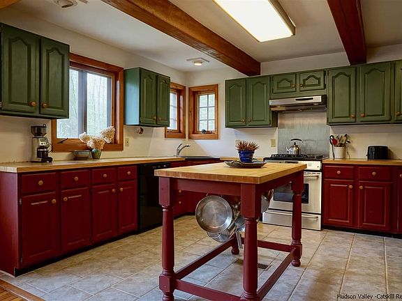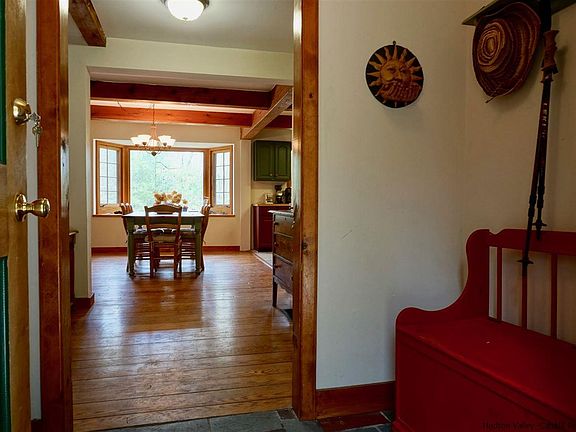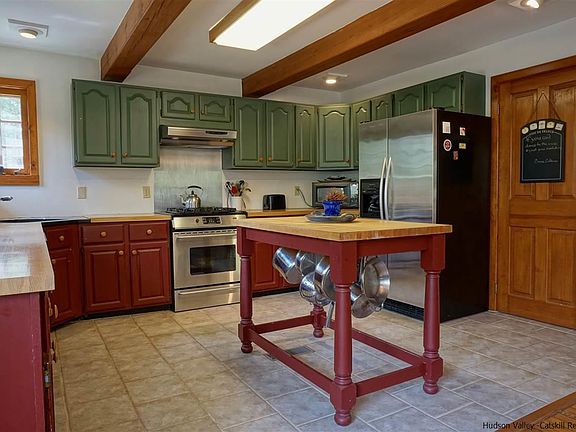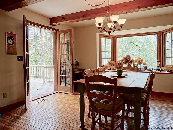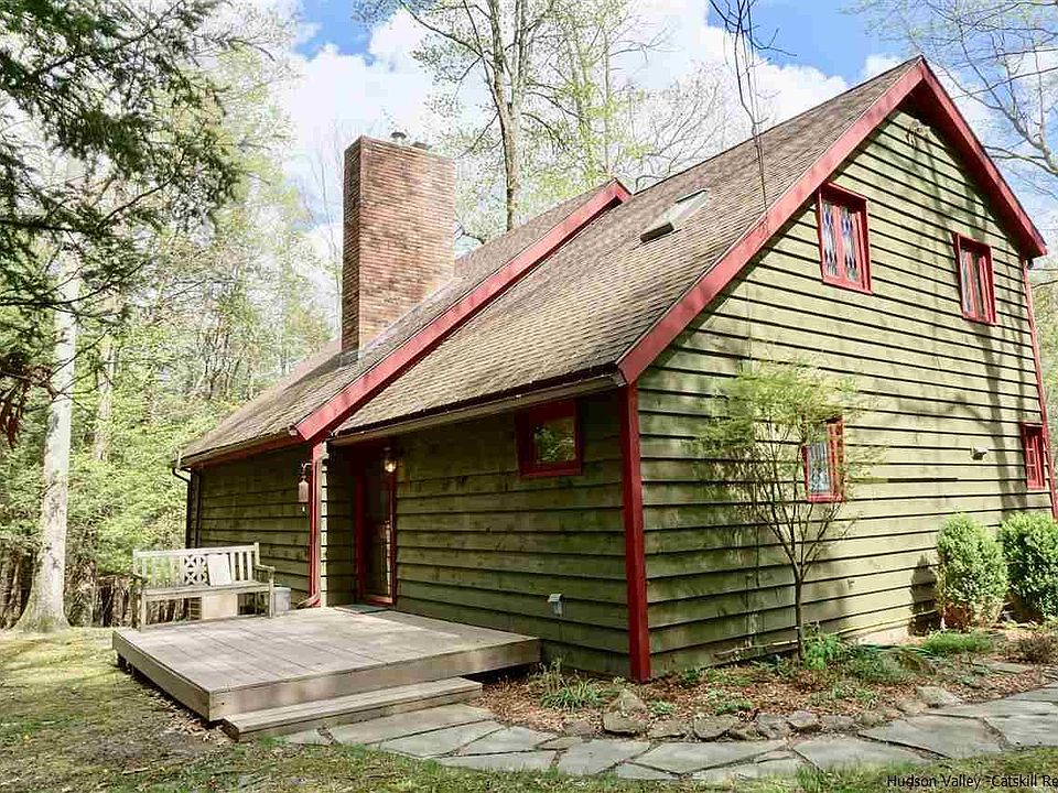 This rustic saltbox is tucked away on 10+ lush acres on a quiet country road in one of the prettiest corridors of historic Stone Ridge. Gorgeous grounds encompass beautiful terraced gardens, deep woods, a sparkling pond, and a large stone patio overlooking it all. The warm and comfortable interior offers something for everyone. A classic country kitchen is big enough for multiple cooks, and the adjacent dining room opens to a deck, which is perched high above the landscape. The double-height living room, with a wood stove set in to a brick chimney, also opens to the deck and is an oasis of calm and light. One of the three bedrooms is a loft-style space with built-in bookcases, one is skylighted, and the master suite opens to a sweet balcony and has the most soothing newly remodeled bathroom. Wide-board floors, beamed ceilings, hand crafted details and a layout made for relaxation and enjoyment are sure to make you fall in love with this home and never want to leave.