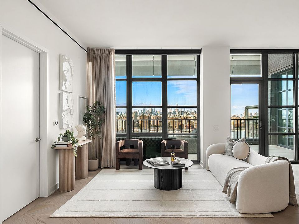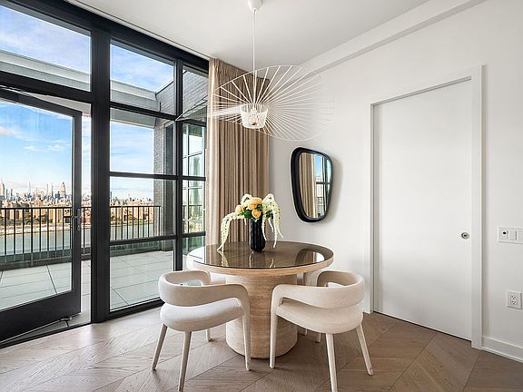 A grand entry leads into an expansive great room framed by floor-to-ceiling divided-light windows that flood the space with natural light and showcase panoramic vistas of the East River, Manhattan skyline, and Brooklyn Bridge. The open chef’s kitchen is both functional and elegant, featuring custom white-oak cabinetry in a tobacco finish, Calacatta Caldia marble countertops and backsplash, and a full suite of Gaggenau appliances. Chevron-pattern white-oak flooring and lofty ceilings add to the home’s warm yet elevated aesthetic, creating a seamless flow between living, dining, and entertaining spaces.