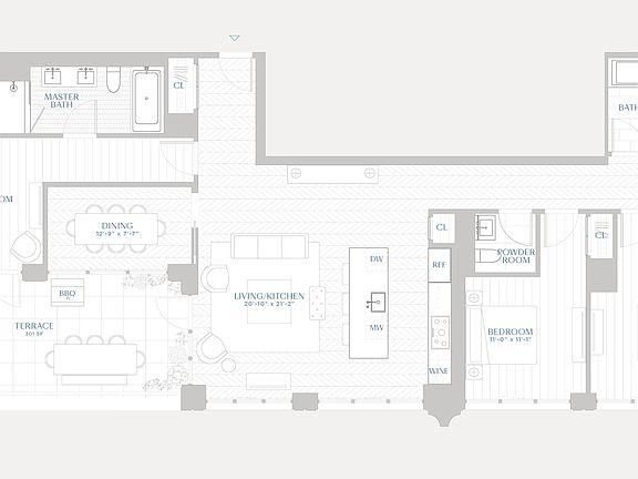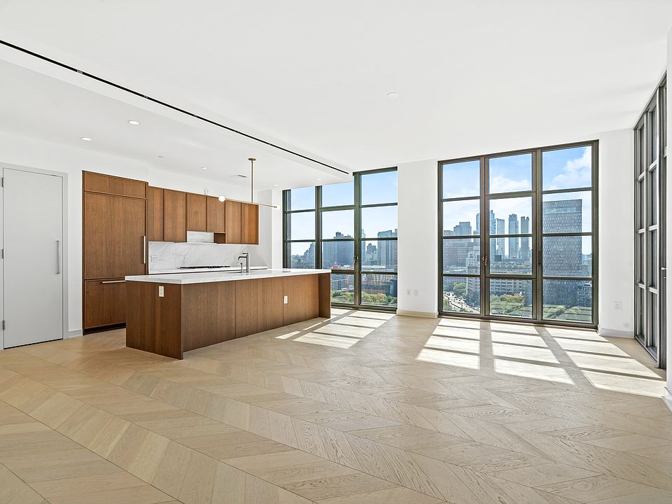 Penthouse 20D-YORK is a 1814sf light-filled three-bedroom and two and a half-bathroom home offering a gracious layout and immense floor-to-ceiling divided light windows that boast expansive views encompassing the Brooklyn skyline to the south. Elegant and refined interiors are graced with chevron-patterned white oak flooring and lofty ceilings heights. A gorgeous 301sf terrace with gas grill lends itself to extraordinary indoor outdoor entertaining.