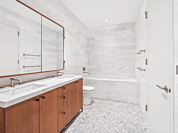 The primary bedroom suite features a large walk-in closet and wide-plank white oak flooring. The en suite bath is a luxurious oasis that boasts stunning views of the river and the Brooklyn shoreline and is adorned with Bianco Bello marble stone and radiant heated Grey River marble floors in a chevron pattern. The bespoke white oak double vanity, Waterworks free standing soaking tub and separate shower are complemented by custom Waterworks fittings.