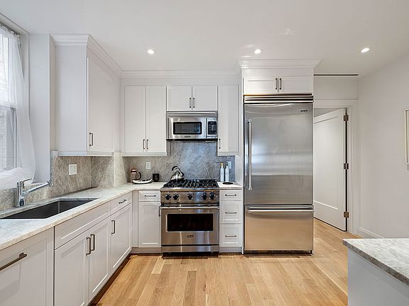 South facing rooms are bathed in sunlight, while white oak strip floors run throughout, tying the layout together with warmth and character. A stacked washer and dryer are tucked away for convenience.
