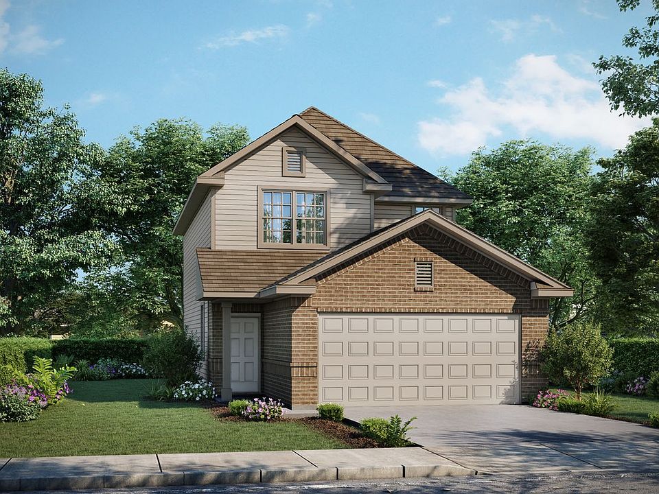 The Darrel V is a two story plan with 4 bedrooms, 2.5 baths, Primary Bedroomnbsp;down, Flex Room up.. Optional Primary Bath options and covered patio available.