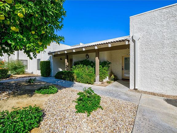 Welcome to Rancho La Paz, where modern upgrades meets desert charm! This fully renovated, turnkey 2-bedroom, 2-bath condo on Fee Simple Land (yes, you own the land!) offers dual master suites - each with 2 large closets! Step inside to a rare gem ideal for flexible modern resort-style living featuring a newly built-in private OFFICE SPACE, brand new fully updated bathrooms with showroom quality vanities, sleek designer hardware, modern finishes throughout, and an overall home that breaks the mold—where every finish, every feature, and every detail has a story to tell! Flow effortlessly from room to room on luxury vinyl plank (LVP) flooring, handpicked for its style and comfort. The home's rich texture and modern lines create a seamless, sophisticated foundation for your personal touch. With beautifully beamed white shiplap vaulted ceilings, upgraded LED recessed lighting features, skylights offering abundant natural light, and an open floor plan, this home is destined to feel bright, spacious, and extremely inviting. The designer-finished updated kitchen features quartz countertops, an island with extra space for bar seating, brand new stainless steel appliances, a large deep single-basin sink, desirable soft-closed drawers, and custom state-of-the-art finishes, opening seamlessly to the living and dining areas. Enjoy year-round comfort with newly installed energy-efficient windows, doors, 3 glass sliders, plus remote-controlled operated ceiling fans strategically placed throughout each room. In-unit laundry access adds highly sought-after convenience that is often hard to find in this area. But wait, it’s not just the inside that shines. Slide open your THREE massive sliding glass doors and find your own sanctuary—a concreted covered patio with mountain views, perfect for morning coffee or stargazing nights. The community is a resort in disguise, featuring 3 pools, 3 spas, 3 tennis courts, 4 pickleball courts, and a dog park for your furry companion. Perfectly situated just minutes from the vibrant heart of downtown Palm Springs, trendy dining, fabulous shopping, and stunning hiking trails, this move-in-ready, sleek & contemporary condo isn’t just a place to live. It’s a place to be—to thrive, to entertain, to savor every day. Why settle for ordinary? This is more than a home. It’s an experience—perfect as a full-time residence, tranquil getaway, or smart investment. Rancho La Paz’s trendiest listing is waiting for you!