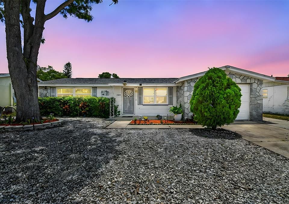 Welcome to this quaint and adorable 2-bedroom, 1.5-bath home that blends comfort, style, and convenience. Step inside to find a spacious living room that seamlessly flows into the dining area, all adorned with sleek modern laminate flooring—perfect for entertaining or everyday living. The kitchen is both functional and inviting, featuring rich maple cabinetry, ample counter space, and a delightful breakfast nook ideal for morning coffee or casual dining. The main bathroom has been tastefully updated with elegant granite countertops, adding a touch of luxury. Enjoy outdoor living in the expansive, fully fenced backyard—complete with a covered patio that’s perfect for weekend barbecues or relaxing evenings. The inviting front patio and large picture window create a warm welcome—ideal for relaxing and enjoying your morning coffee or evening breeze. A generously extended driveway offers ample parking for guests, boats, or extra vehicles. Additional updates include a newer A/C (6months), water heater (6 months) and energy efficient impact double pane windows (2022) providing peace of mind and modern efficiency. Situated right on the Pasco/Pinellas line, with lower taxes and No CDD's or HOA's. It also has unbeatable access to shopping, dining, beaches, and more. Don’t miss this incredible opportunity to make this lovely home yours—schedule your private showing today! Make sure to click on the Video tour link!