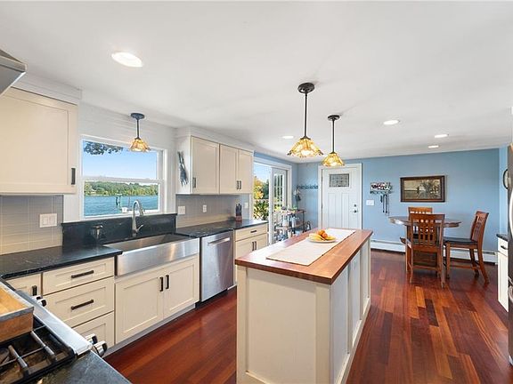 Experience tranquil waterfront living in this charming 2-3 bedroom ranch featuring generously sized rooms throughout. Step inside and be immediately impressed by the fully updated kitchen, a chef's dream featuring gorgeous Soapstone countertops, stainless steel appliances, and rich cherry cabinets. The home is anchored by beautiful hardwood floors and a cozy wood-burning stove, perfect for chilly evenings. Enjoy the outdoors year-round with a fully fenced-in backyard boasting multi-level decking that provides stunning, peaceful views of Gorton Pond. A stamped concrete patio and a two-car garage add convenience and curb appeal. The versatile finished lower-level walk-out offers endless possibilities for an extra bedroom, a spacious living area, or even a future ADU (Accessory Dwelling Unit). Upgrades include 200 Amp service, underground sprinklers in front and a Navian Hot Water system. Don't miss your chance to own this slice of heaven!