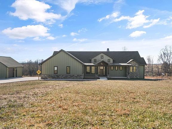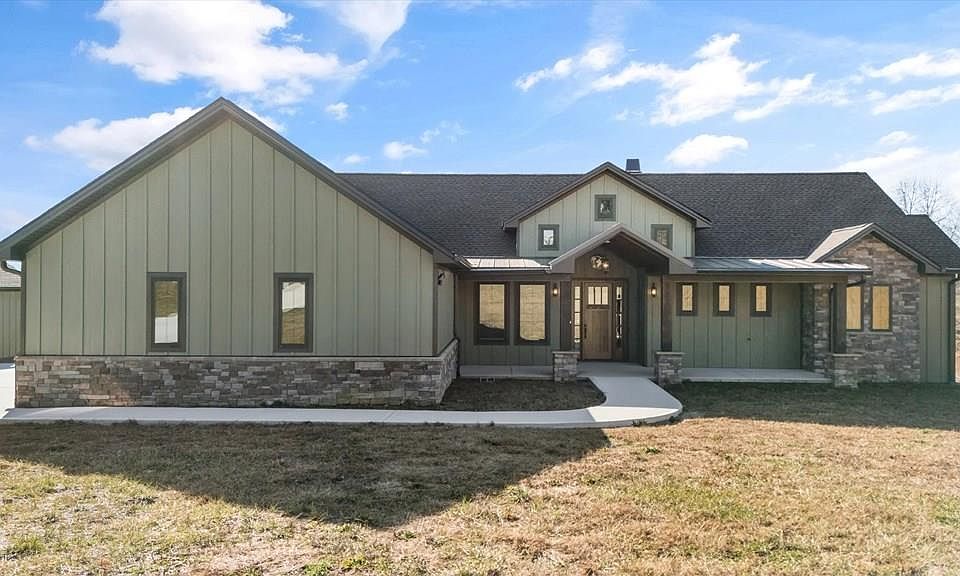 Set on 5.23 acres of rolling Tennessee landscape, this custom-built estate offers a refined blend of architectural craftsmanship, natural surroundings, and mountain-inspired design. From the moment you arrive, the exterior makes a statement with a striking combination of stonework and HardiePlank siding, complemented by a thoughtful architectural roofline and covered entries that suit the surrounding terrain. Both the front and rear patios feature tongue-and-groove wood ceilings, extending the home's craftsmanship outdoors and creating inviting spaces for year-round use. Inside, hickory hardwood flooring runs throughout the living areas, providing warmth and durability. The main living space showcases soaring ceilings with wood accents, expansive windows, and a floor-to-ceiling stone fireplace that anchors the room. Walls of glass frame long-range views across the acreage and toward the mountains. The open-concept layout flows into a custom kitchen featuring custom cabinetry,