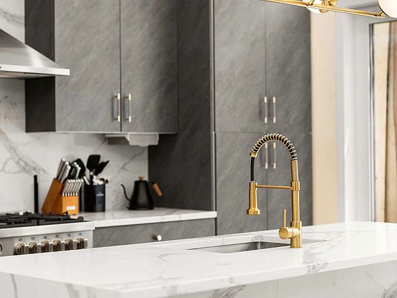 The living area is perfect for relaxation and entertainment, featuring a wood-burning fireplace and a state-of-the-art Bose surround sound system that flows throughout the entire home. The gourmet kitchen is a chef's paradise, boasting a sleek quartz waterfall island that comfortably seats four, along with top-tier appliances, including a Bertazzoni fridge, dishwasher, microwave, and stove.