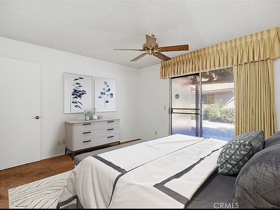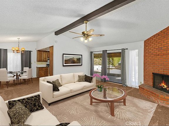 Enjoy expanded outdoor living and excellent visibility with this charming two-bedroom, two-bathroom home. The low-maintenance front landscaping, complete with mature palms and stone accents, provides immediate curb appeal. Inside, the floor plan is spacious and inviting. The main living area centers around a classic brick fireplace in the family room, with direct access to the private, fenced backyard and covered patio. Perfect for seamless indoor/outdoor entertainment. A separate, spacious dining room features a sliding door leading to the side yard. The kitchen offers ample space with an abundant wood cabinetry and a nice backyard view. The two bedrooms are located on the right side of the home. The primary bedroom boasts a ceiling fan, carpet, and a large walk-in closet. Both bathrooms are designed for comfort, featuring grab bars. Additional storage is available in the hallway and secondary bath. Features include dual-pane windows, a two-car garage (with laundry hookups), and driveway parking. Community residents enjoy golfing , have access to clubhouse, outdoor pool, and spa all with an unbelievable low annual HOA. Located close to dining and town amenities.