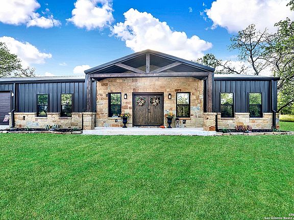 Nestled on 8.6 acres this stunning modern barndominium combines rustic charm with contemporary style. The exterior showcases a striking rock-accented front and a covered front patio, setting the tone for the craftsmanship and detail found throughout the home. Inside, you'll find 3 spacious bedrooms and 2 full bathrooms, designed with comfort and functionality in mind. The open concept living area features soaring ceilings, custom finishes, and a cozy electric fireplace that creates a warm and inviting atmosphere. At the heart of the home, the kitchen boasts custom cabinetry, sleek countertops, a large center island, and modern appliances. Its thoughtful layout makes it as practical as it is beautiful-perfect for family meals or hosting friends, all while flowing seamlessly into the dining and living spaces. Step out back to a covered patio where you can enjoy peaceful evenings, overlooking the acreage and native wildlife. Wildlife is abundant with axis, blackbuck, and whitetail deer often roaming the property adding to its natural beauty. Whether you're looking to relax or simply soak in the natural surroundings, this home offers endless opportunities. With a blend of modern living and country charm, this property provides privacy, space, and timeless style-all ready to become your perfect retreat. The home is still under builder's warranty. Home was completed June 2025.