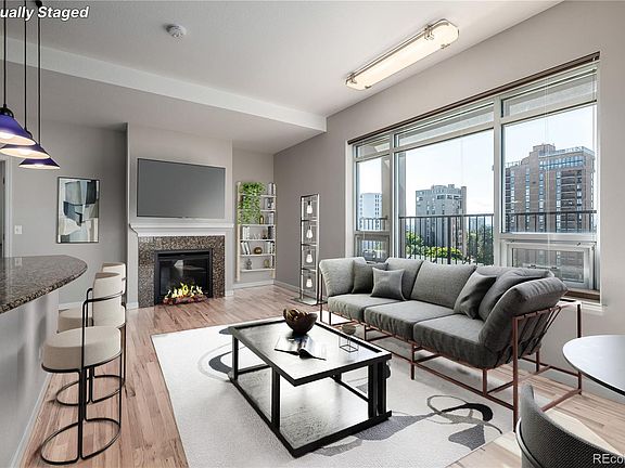 Perched atop an elegant high-rise just up the road from the iconic Cheesman Park, this penthouse suite celebrates city living with panoramic views that sweep from the Denver skyline to the Rocky Mountains. High ceilings lift the eye upward while oversized windows flood the home with light, creating an ever-changing backdrop that frames the city in its most beautiful form. The living room centers around a chic fireplace, its modern design enhanced by contemporary fixtures and warm honey-toned hardwoods that enliven the space. A thoughtfully designed island with pendant lighting connects the kitchen and living area seamlessly, encouraging both effortless flow and refined entertaining. In the kitchen, full-height cherry shaker cabinetry combines timeless style with abundant storage, complemented by stainless steel appliances, vented hood, and elegant countertops that offer a chef-ready workspace. The primary suite rises to meet the views with a coffered ceiling and oversized windows that extend the sense of volume and serenity. An expansive walk-in closet and spa-inspired ensuite bathroom offer a retreat within the retreat. The secondary bedroom is equally well-appointed with a separate accessible bath and thoughtful design. Everyday convenience is elevated with in-unit laundry, two deeded covered parking spaces, and a location that places Cheesman Park, the Denver Botanic Gardens, and countless restaurants and cafes within easy reach. A home of both historical character and modern function, this residence blends chic sophistication with the vibrant energy of Denver living.