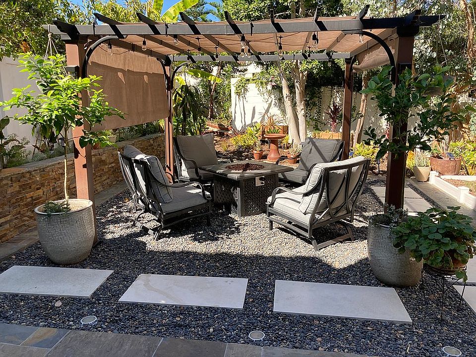 Unique townhome with newly remodeled, beautifully designed yard, complete with pergola, fire pit with outdoor seating and fountain, creating indoor/outdoor living with ample patio area for BBQ'S and entertaining. THIS IS A RARE AMENITY FOR THIS GATED COMPLEX. Fully replaced double-paned windows and doors provide energy saving, while being located at the very end of a cul de sac, create a quiet and tranquil setting. A MUST SEE LOCATION TO APPRECIATE . LOTS OF PRIVACY AND NATURAL LIGHT COMING THRUOUT THE LIVING AND DINING ROOM AREAS. . TWO MASTER BEDROOMS LOCATED ON SECOND FLOOR ONE HAS WALKIN CLOSET THE OTHER BDROOM HAS HIS AND HERS CLOSETS. EACH BEDROOM HAS A BALCONY AREA WITH PLENTY OF ROOM FOR YOU TO ENJOY.
