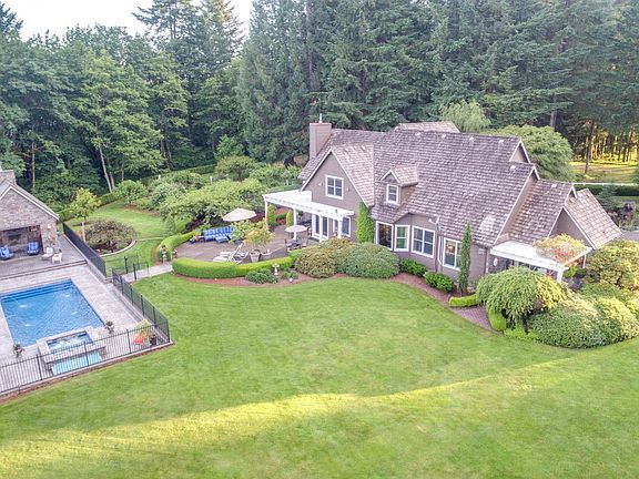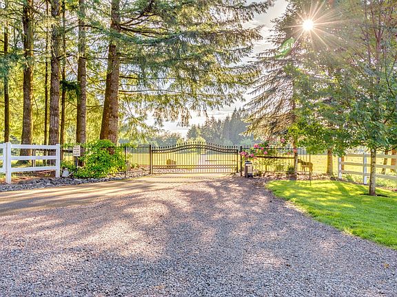 20 acre equestrian estate w/breathtaking Mt Hood views! Complete w/barn w/stalls, tack rm & 3 bay garage/workshop. 4BR/2.2BA Custom home w/theatre + office & main level master suite w/fireplace & patio. Gourmet kitchen w/gas appliances leads out to patio & pool deck for ease in entertaining. Saltwater pool & hot tub w/pool house w/full bath, outdoor shower & BBQ set up + fireplace. English cutting gardens, lawns, fenced pastures & turnouts, all privately tucked away at the end of the lane.
