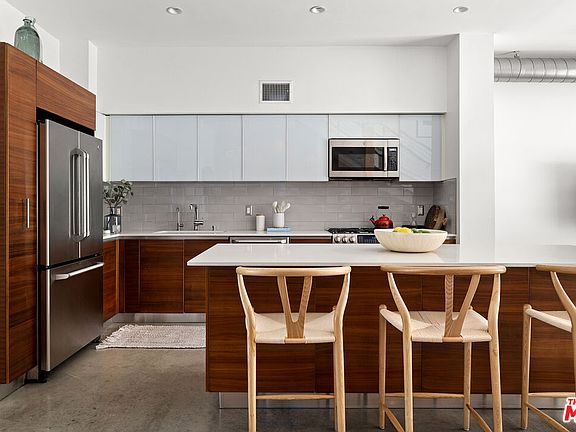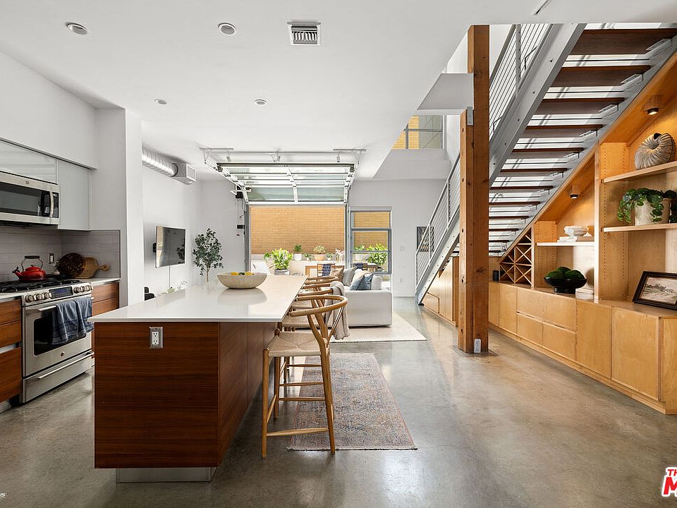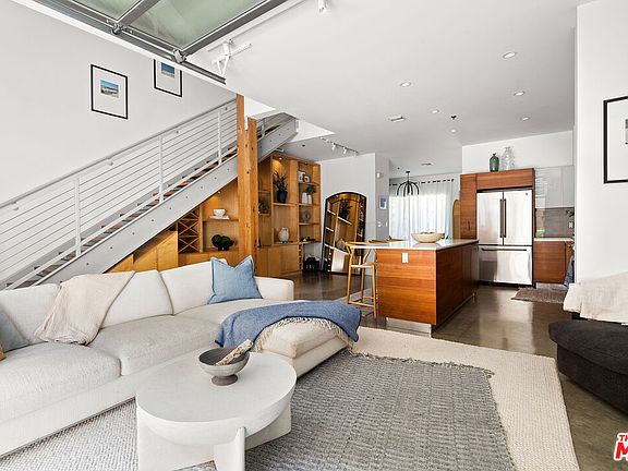 Introducing Modern Westside living at the T-Lofts! Enter through lushly landscaped walkways to this stunning two-story unfurnished end unit with abundant natural light and no neighbor on one side. The open floor plan boasts soaring ceilings, polished concrete floors, recessed lighting, and a bonus den ideal for an office. A chef's kitchen with stainless steel appliances, Caesarstone counters, and reverse osmosis system complements custom wood shelving under the staircase. An industrial roll-up door opens to a large patio for alfresco entertaining. Upstairs offers two bedrooms and baths, including a main suite with walk-in closet and spa-like bath. Two side-by-side parking spaces sit near the elevator. Community amenities include a hot tub, BBQ/picnic areas, fitness center, EV charging, and guest parking. Centrally located near Sawtelle dining and the Expo Line for easy access to Downtown LA and Santa Monica.