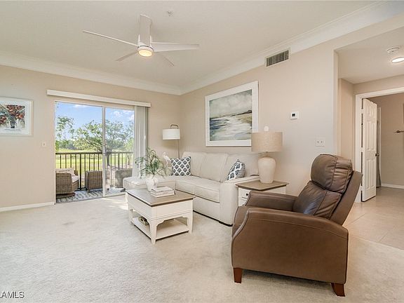 Don't miss this opportunity to own a completely updated and remodeled 3-bedroom, 2-full bathroom condo in the highly sought-after community of Royal Greens At Gateway in Fort Myers! This stunning unit offers the perfect blend of modern elegance and resort-style living. Step inside and be greeted by a light and bright open floor plan featuring nine-foot ceilings and neutral paint throughout. The fully remodeled kitchen is a chef's dream, boasting gorgeous granite countertops, including a convenient island, and upgraded black stainless steel appliances. Relax and unwind in the beautifully renovated bathrooms, both featuring stylish granite counters. The walk-in primary bathroom is a true retreat, complete with sleek glass shower doors, elegant subway tile, taller cabinets, and new, taller toilets. Enjoy the comfort of new carpet and freshly painted walls, lanai, and ceilings. The tile flooring has been meticulously stripped and re-grouted, giving it a fresh and clean look. All lighting fixtures have been updated, including four ceiling fans with lights to keep you comfortable year-round. Prepare to be captivated by the breathtaking views from every window, showcasing serene lakes, lush golf course greens, and swaying palm trees. This condo is truly move-in ready, with no detail overlooked. Beyond the beauty of the unit itself, you'll love the incredible on-site amenities, including: