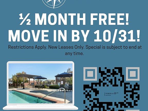 - Special offer! Move in by October 31st and get Half a Month FREE Rent don't miss out! (New leases only. Restrictions apply. Pricing and specials subject to change.)