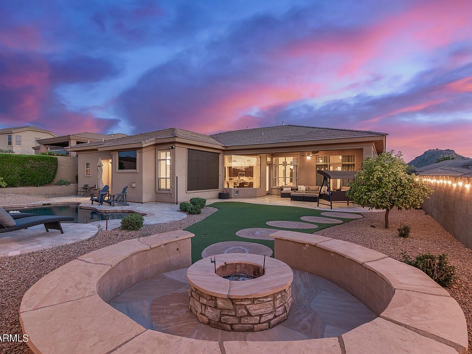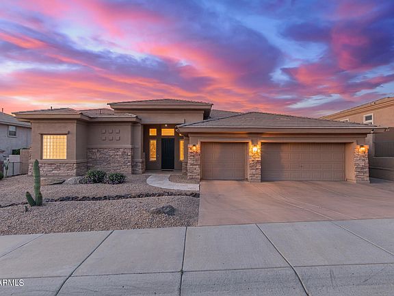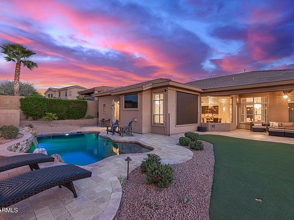Your dream home is here! Nestled in Desert Vista, this exquisite home offers a stunning facade with stone accents, completed by a low-maintenance landscape and a spacious 3-car garage. The breathtaking interior boasts an open floor plan, Travertine flooring throughout main areas, plantation shutters, and stylish light fixtures. The cozy family room features a fireplace, which creates an inviting atmosphere. The gourmet kitchen showcases recessed lighting, ample wood cabinetry, tile backsplash, high-end SS appliances, granite countertops, and a center island. The breakfast nook overlooks the back patio. The oversized primary bedroom has exterior access, and lavish ensuite flooded with natural light. Two vanities, a soaking tub, a large shower, and a walk-in closet complement the spa-like retreat. Convenient den is ideal for an office. The backyard is an entertainer's dream, featuring a covered patio, a built-in bench around the fire pit, a refreshing pool, stone floors, and a putting green. This home is a true gem. Experience the magic firsthand!