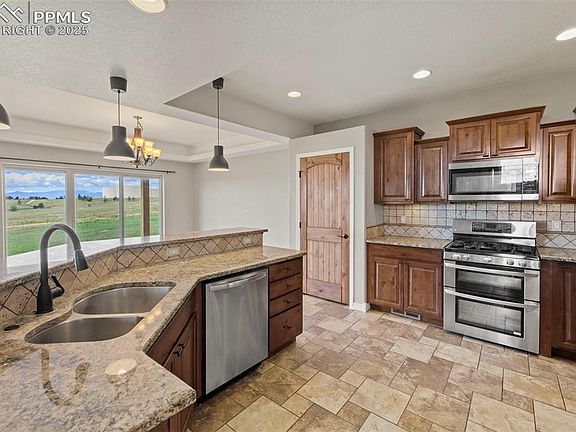 Custom, impeccable, quality-built home on 2.5 acres with sweeping Pikes Peak and whole front range views and a brand-new roof. This residence combines an open floor plan with knockout amenities and breathtaking natural surroundings. The great room impresses with a stone fireplace, custom built-ins, and abundant natural light. The gourmet kitchen features granite countertops, stainless steel appliances with a double range oven, a pantry, breakfast bar, and spacious dining area. A striking wrought-iron staircase leads to the expansive primary suite, complete with a five-piece bath, private balcony, and two additional bedrooms. A dedicated office with French doors provides an ideal work-from-home space with brand new LVP flooring. The lower level offers a large recreation room, wet bar, fourth bedroom, full bath, and generous storage. Exceptional finishes include hand-scraped bamboo wood floors, earth-tone tile, stained concrete, stamped concrete covered patio, arched doorways, and multi-dimensional ceiling details. Enjoy 360-degree views from the expansive property, including stunning mountain vistas (with some water tower obstructions) and even 4th of July fireworks from your own balcony. Located near the Pikes Peak School of Expeditionary Learning, this home delivers both tranquility and convenience. With its new roof, incredible craftsmanship, and breathtaking setting, this property is a rare find—schedule your private tour today!