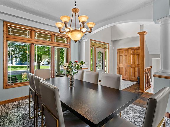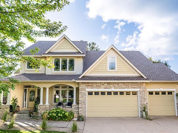 The exterior boasts gorgeous curb appeal. First thing you will notice besides the beautiful landscaped yard with in-ground sprinkles, is the concrete driveway leading to the 3 car heated garage. An expansive covered front porch greets you to the front door. Inside, the open and inviting layout begins with a two-story slate-floored foyer, and a catwalk that overlooks the 2 story massive lower level family room/great room with floor to ceiling windows and leads you to a cozy hearth area with gas fireplace and informal dining. The spacious kitchen is a true centerpiece with a huge island, granite countertops, under cabinet lighting, stainless steel appliances and adjacent formal dining with new premium carpet. Step outside onto your large maintenance free deck which overlooks the creek that connects two ponds. In the winter, you will find it being used for winter ice skating and hockey. A convenient half bath and laundry room with large walk-in closet complete the main level. New premium carpet leads you upstairs to four spacious bedrooms, a full bath with dual sinks for 3 of the bedrooms to share and at the end of the hall, you will come into the luxury owner’s suite with tray ceilings, an over-sized (HUGE) walk-in closet and a spa-like bath retreat, with jetted soaking tub, walk-in shower and heated floor. The lower level is designed for entertaining! All new LTV flooring, floor to ceiling double-sided fireplace, floor to ceiling windows, two expansive living areas or recreational area, custom wet bar with under cabinet lighting, wine and beverage fridges, another huge bedroom that doubles as an office, a fully renovated full bath in 2024, a three-season hot tub room and storage galore! All newly painted interior in 2025, new roof in 2024, new furnace and A/C in 2022 and new water heater in 2025. Just move in and enjoy!!