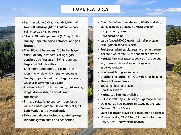 Spacious rancher on 5.46 acres with 6,080 sq ft in the main home plus a 512 sq ft 1 bed/.75 bath apartment with its own laundry. Main floor offers 3 beds, 2.5 baths, office, and laundry; daylight walkout basement includes 1 bed, 1.5 baths, bonus room, kitchenette, and separate laundry. Large kitchen with island, pantry, and all appliances. Primary suite features walk-in closet, garden tub, and double sinks. 4-car extra deep attached garage plus RV parking with dump/connection. Heated/insulated 64x40 shop with 20x40 workshop, 16x40 lean-to, 12’ door, and air compressor. Grounds include fenced 40x20 garden with drip system, 8x16 shed with sink, fruit trees, koi pond, pergola, and water feature. Covered front porch and back deck capture stunning southwest views. Zonal heating, central A/C, 2 hot water tanks, sprinkler system, central vac, and 400 amp service. Well, septic, Avista gas, and garbage service. Freeman School District. Built in 2001.