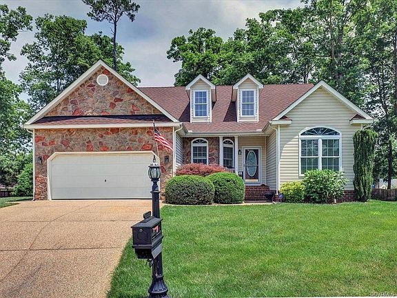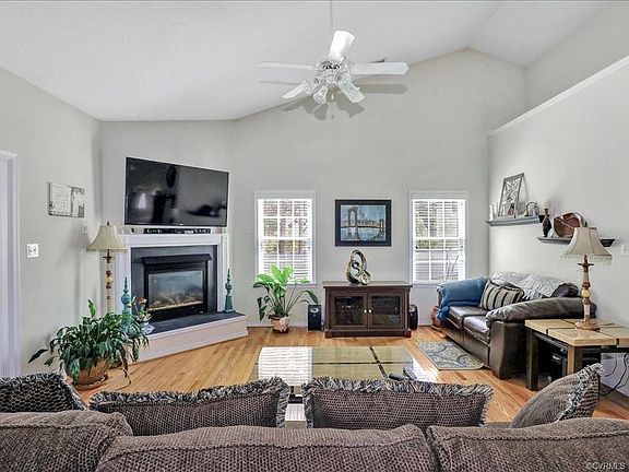 Beautiful ranch home with covered front porch in popular Clay Pointe Community Midlothian/Hull corridor. Family room with vaulted ceiling, hardwood floors, and corner gas fireplace. Formal dining room with hardwood floors, elegant curved doorway with columns, Tray ceiling and Wainscoting paneling, open to kitchen. Large kitchen with hardwood floors, bay window in breakfast area, breakfast bar, stainless steel appliances, tile backsplash, desk area, and custom cabinets. Master bedroom on separate side of home, perfectly separated for privacy, has Tray ceiling, two walk-in closets, door to deck, and en-suite master bath with oversized walk-in shower. Other two bedrooms on opposite side of home with full bath. Laundry room with utility sink, built-in shelving, and access to garage. Attached two car garage with aggregate driveway. Vaulted 13X21 screened porch, rear deck, privacy fence, and detached storage shed on large cul-de-sac lot. Low maintenance vinyl siding with stone accent. Irrigation system in front and side yards. Minutes to Swift Creek Reservoir, Restaurants, parks, schools, and retail!