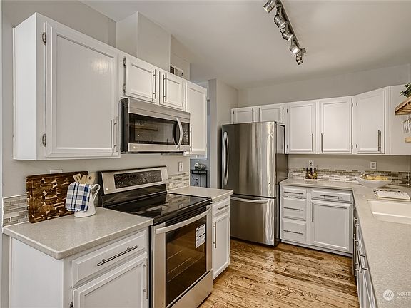 Welcome Home to The Grove at Harbor Pointe, a highly desirable and well-managed community. This beautifully updated townhome nestled in a quiet cul-de-sac features a spacious living room w/ cozy gas fireplace and an urban style kitchen complemented by Corian counters and SS appliances. A perfect sanctuary awaits in the primary suite with walk-in closet and refreshed, spa-like bathroom w/ dual vanity/shower. Additional updates include new hall bathroom, new interior paint, new light fixtures, new cabinet/door hardware throughout. Entertain and enjoy summer BBQ's on the private back deck with built-in bench and a porch swing. Close to shopping, restaurants, Harbour Pointe Golf course, and Boeing. Highly rated schools.
