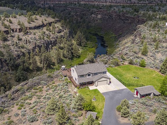 Beautiful fenced, gated 5 acre property on Deschutes River. This 5 bedroom home has a breathtaking river view from house and deck that creeps up to the canyon's edge. With a mountain view from the pasture to the sights and sounds of the river this is a spectacular property. Downstairs is balanced between open concept and private entertaining space. Large kitchen boasts a peninsula and island, outstanding cabinet and pantry storage! 5 bedrooms upstairs are nicely spaced for privacy. The beautiful yard and natural rock formations create a peaceful setting. Extra-large pole barn provides covered storage space for large toys. Fully owned large solar array, provides the entire property with monthly electric bills of $15 for 8-10 months a year depending on winter usage. Enjoy the 3 bay garage, with shop and insulated tack room. Hay storage or horse barn, 3 sided shelter, 3 fenced pastures complete property for your animals. At 2.4 miles to NW Lower Bridge Way it's a quick trip anywhere!