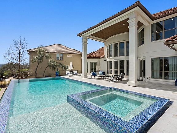 This jewel of Austin located in the prestigious community of the gated University of Texas Golf Club Section of Steiner Ranch is a custom-crafted 5 bedroom, 5 bath home offering unmatched luxury & comfort. From the moment you step inside the dramatic 2-story foyer with designer wall treatments, a grand staircase, & elegant design choices flowing throughout the home, there is a cohesive backdrop for everyday events and major milestones. No detail has been overlooked in modern sophisticated family room space to entertaining or just to relax and unwind. Details include custom-made built-ins grounded by a fireplace & wall of glass windows, offer breathtaking panoramic views as you make your way to the kitchen. The expertly designed modern chef's kitchen is waiting for you with granite counters, rich wooden cabinetry, a sizable center island, & name-brand stainless appliances. This kitchen is truly the heart of this spectacular home! Exit the main entertaining area to the patio offering a seamless integration from indoor to outdoor living. The EAST facing outdoor oasis provides functional & intricate landscaping that compliments the natural surroundings, the patio overlooking the spa, infinity pool, & an expansive, flat yard below which offers views of Lake Austin & the valley beyond. No matter how you choose to spend your day, you can retire to the truly magical owner's suite with the perfect combination of jaw-dropping panoramic views, abundant natural light, & extravagant but elegant finishes. This home also features numerous custom built-ins, walk-in closets & attic spaces, a home theater room & guest suite on the main level. Located within the gated University of Texas Golf Club Section and zoned to Vandegrift High School—widely recognized as one of the top schools in the state, with a championship football program, the #1 ranked band in Texas, and a long list of other accolades.