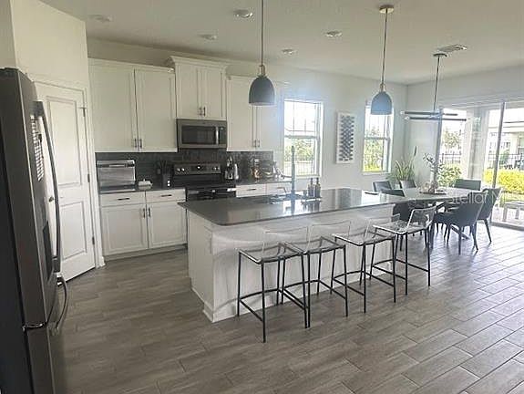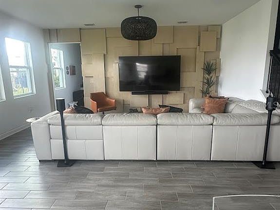 This stunning Peabody model home offers 3,290 square feet of living space, thoughtfully designed for comfort, luxury, and modern living. The property includes a two-car garage, with the third garage transformed into a state-of-the-art digital podcast studio. Its interiors were decorated by a professional designer, ensuring a refined and stylish atmosphere throughout. Situated on a corner lot with generous space, this property is perfect for adding outdoor features tailored to your lifestyle. As an added value, the purchase of this home includes a complete 3D design plan for the entire terrace, featuring a swimming pool, full outdoor kitchen, basketball court, BBQ area, and fire pit. Located in the sought-after Storey Park community, the home is close to the new elementary and high schools as well as Innovation Middle School, with easy access to highways 417 and 528. The community also offers premium amenities, including two pools, a gym, sports courts, and event halls. Inside, the home boasts 5 bedrooms and 3 bathrooms, with custom-designed closets in the master suite, motorized shades on the first floor, and motorized blackout shades in the master bedroom. Additional features include: Solar panels (transfer to new owner; $90/month) Over $50,000 in luxury upgrades and décor A modern wine room Tile flooring downstairs and carpet upstairs A whole-house water filtration system. This home truly blends elegance, functionality, and lifestyle—offering not only a move-in ready property but also the vision of your dream outdoor retreat.