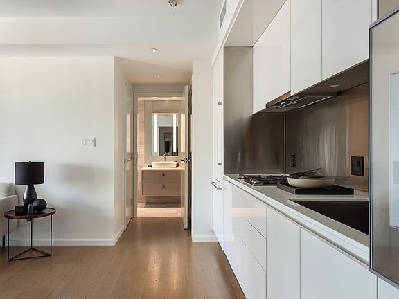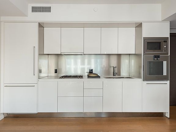 Floor-to-ceiling windowsItalian kitchen cabinetrySleek stainless steel backsplashQuartz countertopsCreston smart home technologyElectronic blinds