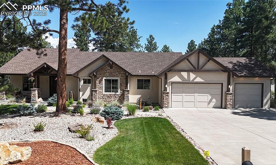 This exceptional 2017 custom ranch exemplifies high-end finishes, energy-efficient construction,& superb craftsmanship throughout. Demonstrating true pride of ownership, this move-in ready home offers sophisticated living nestled w/in a serene forest of towering ponderosa pines. Set on .92 wooded acres in Larkspur’s Sageport community, the remarkable outdoor setting inspires incredible views from every window. Enjoy 4 outdoor living areas, including a flagstone patio w/firepit & a walkout patio w/relaxing spa (added 2021). Home is thoughtfully positioned to ensure that no structures will be built directly behind it, preserving privacy & natural beauty. Upon entry through the impressive 9-ft solid wood door, you are welcomed by an open-concept floor plan w/rich hardwood floors & soaring 12-ft ceilings. The gourmet kitchen features top-of-the-line stainless steel appliances, new quartz countertops & alder wood cabinetry. This area flows into the spacious dining room, family room with 9-ft windows and stone fireplace, and deck—ideal for entertaining. The expansive primary bedroom includes a luxurious 5-piece en-suite bath w/soaking tub, walk-in shower, & large walk-in closet. The main floor also offers a private study w/French doors & built-in cabinetry, updated powder room, & guest bed w/en-suite bath. Lower walkout offers a family room w/wet bar, 500-sq-ft game/flex room, 2 beds (one w/en-suite bath), hall bath, separate HVAC thermostat, & 500 sqft of storage. Oversized 3-car garage is insulated & finished w/epoxy flooring & workbench. The driveway boasts a newly added crushed granite extension, accommodating a large truck or RV. Exceptional value! No metro district=lower taxes than new-build neighborhoods, City water, sewer, natural gas, & high-speed internet! Near Bear Dance & Perry Park golf courses. 30-mins to DTC or COSprings, 15 mins to Castle Rock.