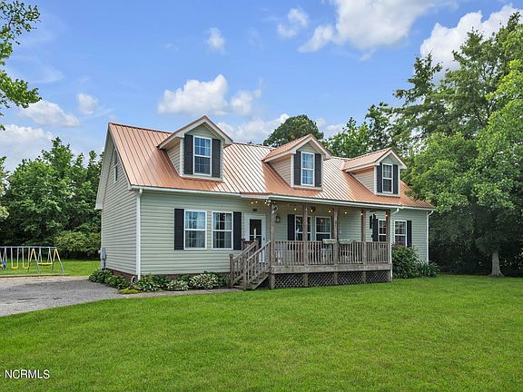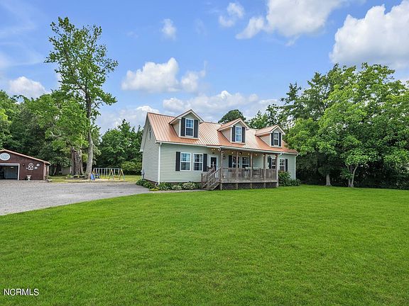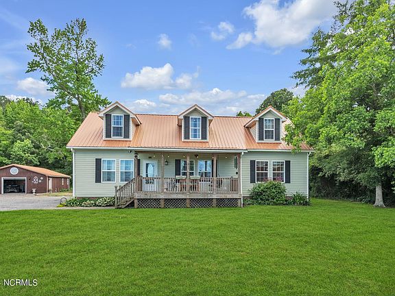SERENE SETTING on one acre on the outskirts of Elizabeth City! This spacious home with enticing front porch and amazing metal roof welcomes you! This open concept floor plan has an updated kitchen, flooring and appliances. Two spacious Ensuites on the 1st Floor (including the primary, with LARGE closet AND private exit to deck) The 3rd bedroom with full bath is upstairs. Three bonus rooms, two up and one down (perfect for a home office(s)). Many updates. The large detached garage with a private bonus room with full bath and kitchenette, makes for a great private escape/gameroom or guest area! You will also enjoy the large deck and above ground pool!