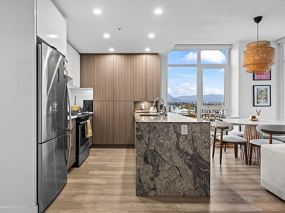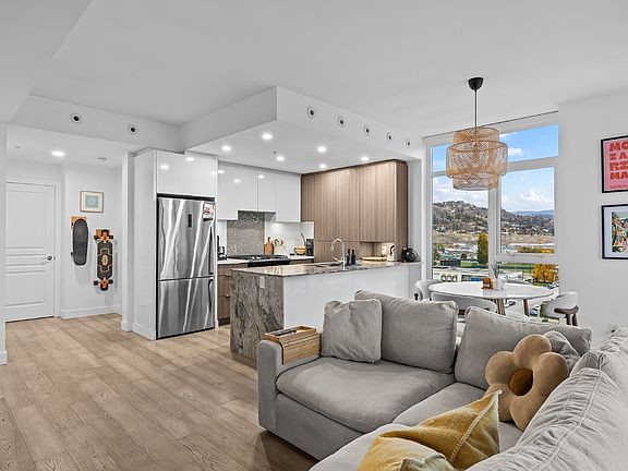 The chef-inspired kitchen is designed for both style and function, featuring a waterfall island, stainless-steel appliances, gas range, two-tone cabinetry, and under-counter microwave—a perfect space for entertaining. The open layout flows seamlessly to a generous balcony, ideal for relaxing and soaking in the Okanagan ambiance.