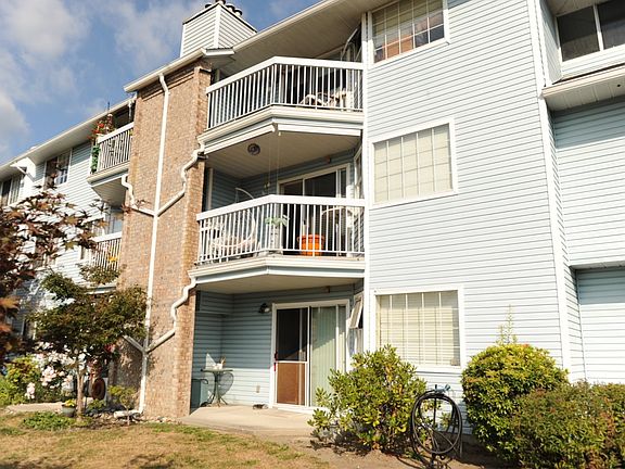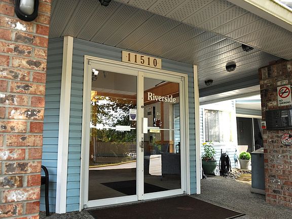Fraser view at Riverside. Large 1 Bdrm, 1 Bathrm ground level unit with a view of Fraser River. Kitchen with oak cabinets, dining rm, living rm with gas fireplace & sliding door to patio with view of the Fraser River, adult 55+ complex. Unit has its own laundry, storage room which could be used as a den. Pet friendly, guest suite and activity room for parties. Close to shopping, West Coast Express, transportation & across from Brickwood Park & tennis courts.