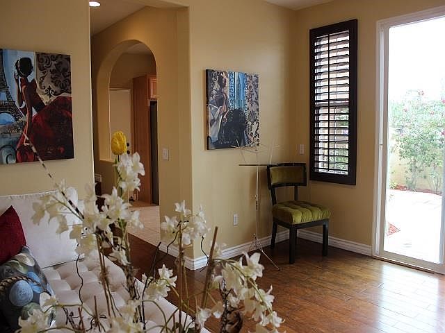 The jewel of the gated Tuscany community now is available. About $50K upgrade, the solid wood floor throughout the house completes with the custom matched wood-window shutters. The open bright kitchen with granite counter tops is equipped with brand new high-end stainless steel appliances and a beautiful French door fridge. 2-attached car garages with epoxy floors connect to the house and the huge back yard designed with beautiful landscaping and desirable endless view. The 4-bedrooms and 3 baths have custom paints, the downstairs bedroom with its bathroom is what you're looking for to separate your upstairs private area. The house is wired ready for 2 different dishes.