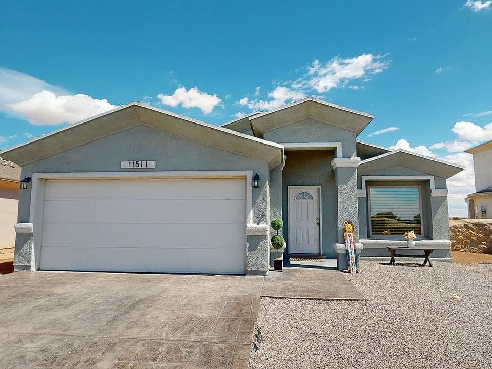 Welcome to this beautifully maintained 4-bedroom, 2-bath home in the heart of Socorro—just minutes from El Paso with easy access to I-10 (approx. 5 miles) and Horizon Blvd (approx. 13 miles). Built in 2021, this single-story gem offers 1,501 sq ft of living space with an open-concept layout perfect for entertaining. The kitchen features granite countertops, upgraded flat-panel cabinetry with brushed nickel handles, and elegant light fixtures throughout. Enjoy refrigerated air, energy-efficient windows, and a spacious backyard with toom to play, host plus a storage shed—ideal for tools or extra space, keeping your 2 car Garage free of clutter. Located in the quiet Leonor Estates subdivision, just steps from a large community park. Don't miss your chance to own a move-in-ready home with style, comfort, and convenience!